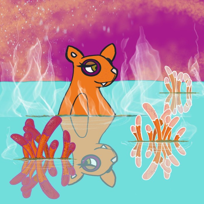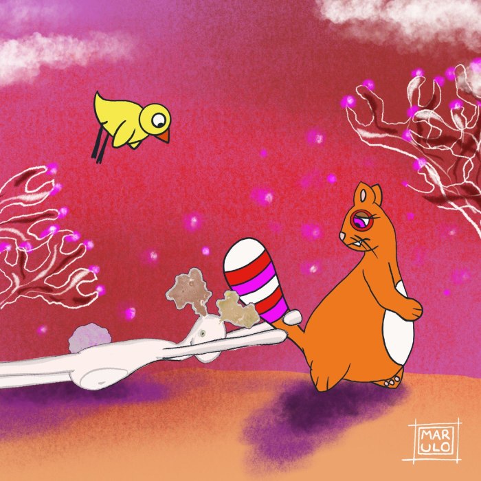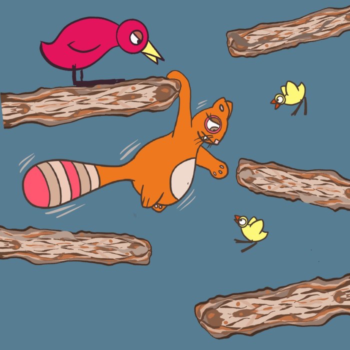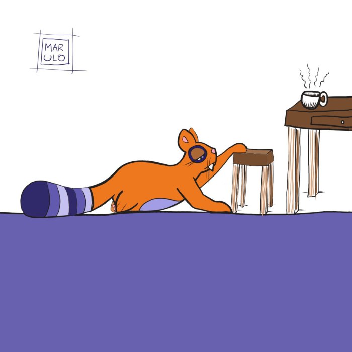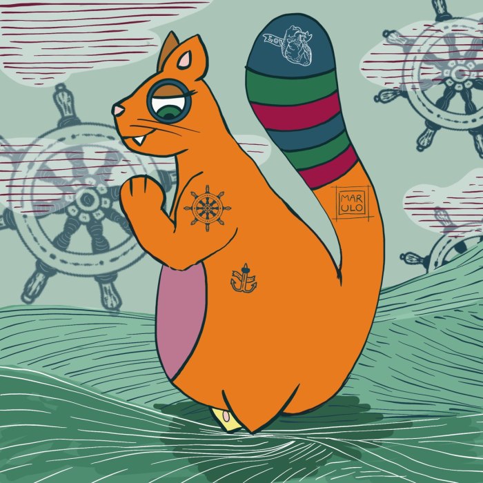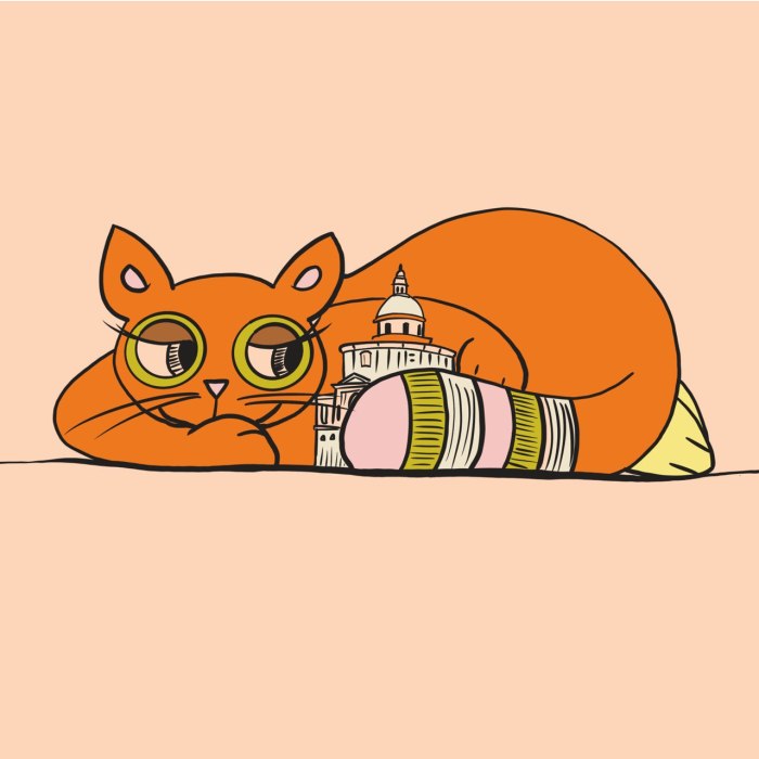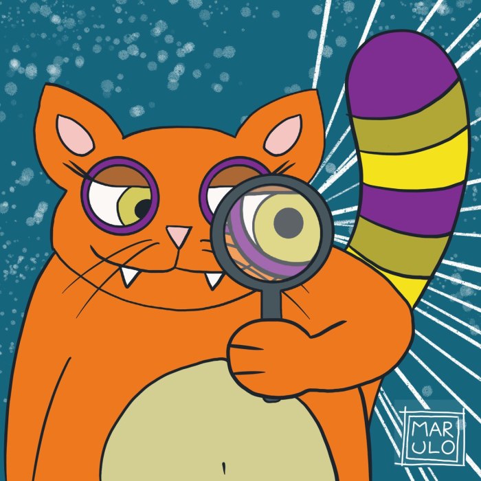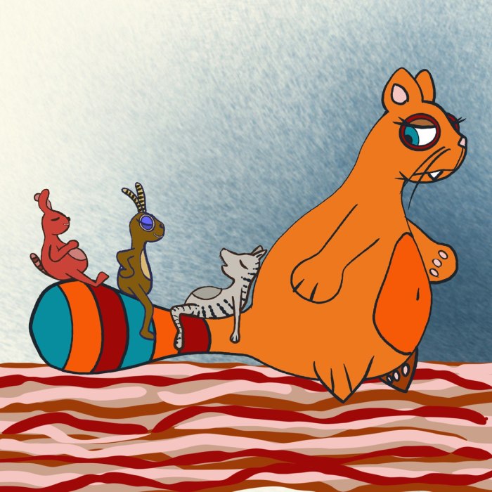 È una simpatica gatta grassa e arancione dalla grossa coda multicolore che si abbina al mondo in cui viaggia; perfetta per vignette singole, potrebbe evolvere anche in un fumetto per qualsiasi età. Ma al momento resta la libera compagna di chi ha voglia di seguirla.