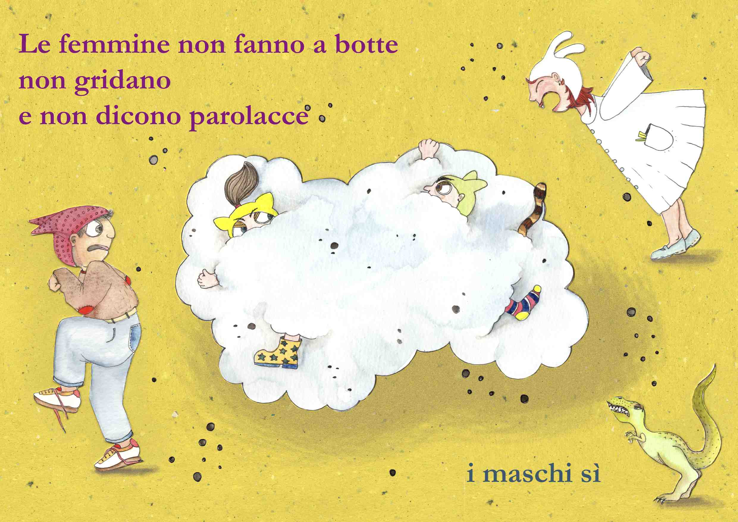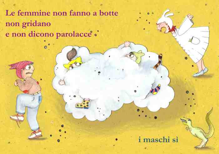 Dans ce livre, chaque stéréotype exprimé par des mots correspond à une image qui le contredit, comme dans l’exemple ci-dessous (« Les filles ne se battent pas, ne crient pas et ne disent pas de gros mots – Les garçons oui » ).